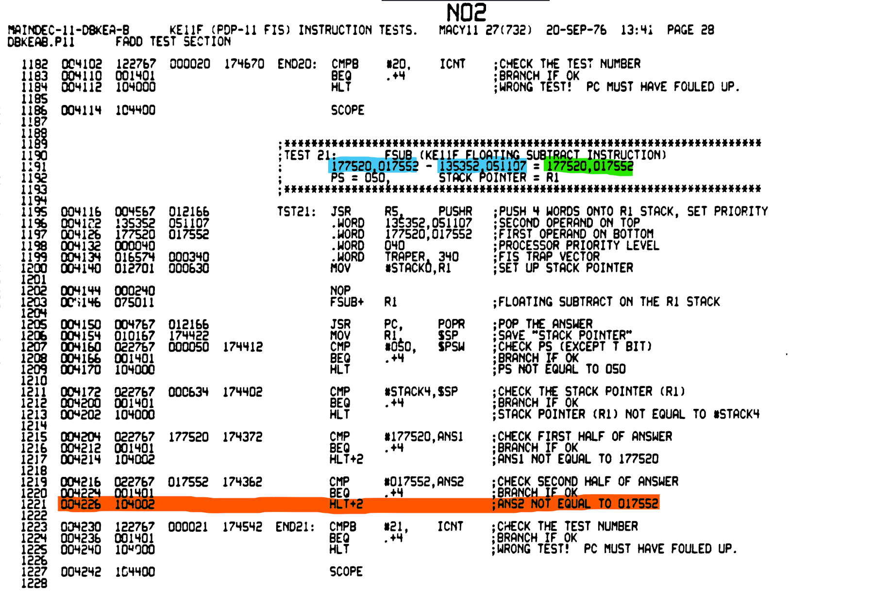 In this case, the error was in test 21, a basic subtraction. The first 16-bits were correct, but the lower 16 bits did not match the expected answer.